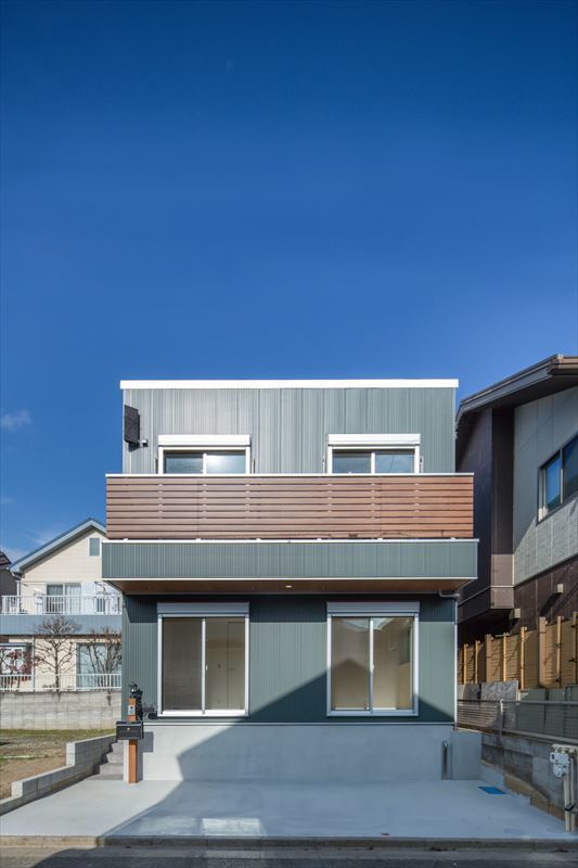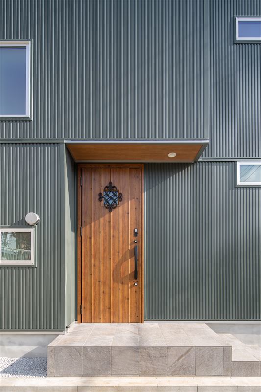 奥様のご希望で、外壁はグリーン系のガルバスパンに部分的に木をイメージした部材を使った、シンプルでスクエアなフォルムが特徴的です。