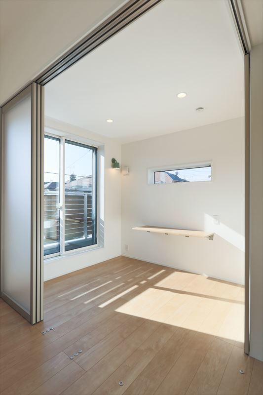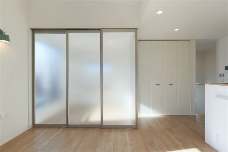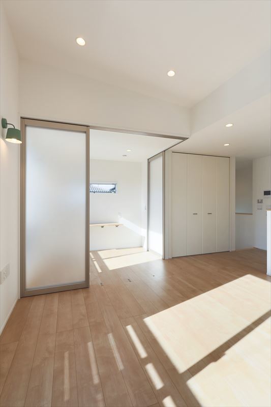 リビングはSE構法の良さを生かしたワンルーム空間ですが、ご両親が来た時に泊まれるようにと、三枚引き戸で仕切れるようになっているのも特徴です。