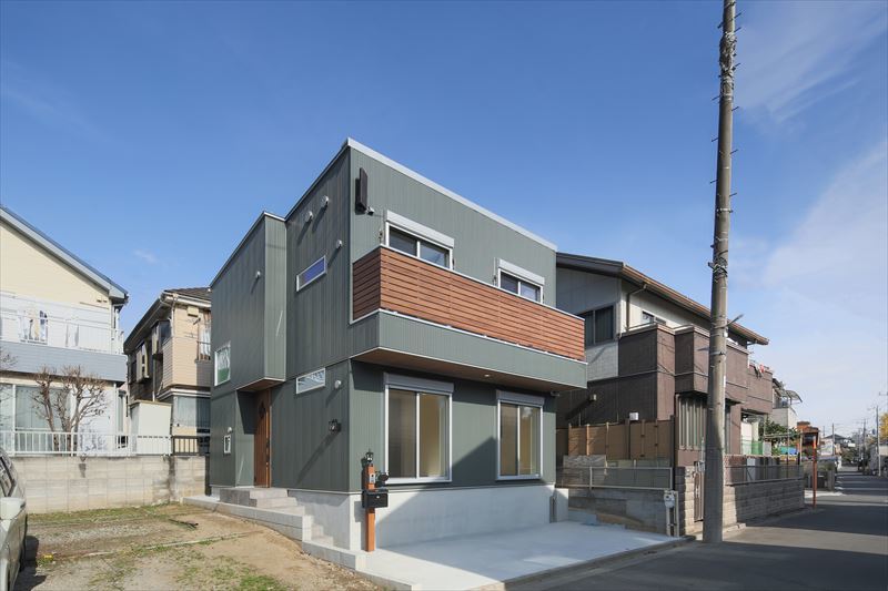 奥様のご希望で、外壁はグリーン系のガルバスパンに部分的に木をイメージした部材を使った、シンプルでスクエアなフォルムが特徴的です。