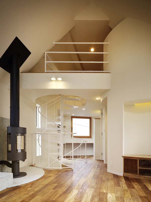 また、らせん階段や勾配天井などもその空間を形成する特徴のあるアイテムになってます。